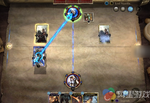 双线战场会导致玩家的操作复杂度和可能性更高,Bethesda也做了相应调整。例如理论上双线战场上的快攻卡组会更有优势,但玩家可以看到自己头像上有五个蓝色标识,玩家每被打击一次,则消耗一个蓝色标签,并瞬间抽取一张牌,如果是法术牌则可以瞬间(比较类似《万智牌》的打断)打出去,手牌也是如此。不像《炉石传说》因为双方的卡差和回合后手的问题而让快攻得寸进尺,这里的快攻需要处理的更加细腻。