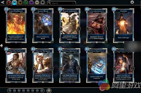 具体到牌库,大部分卡牌将以力量、智慧、意志、敏捷、耐久进行主要分类,并辅以混合、和中立阵营的牌组。其中混合较为特殊,不同于人人都可用的中立卡牌,混合阵营将以主要属性的两色进行搭配,如一把魔法武器需要能够掌握力量和智慧的英雄们才能够使用。