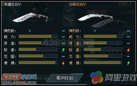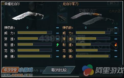 来看与其他近战武器的对比图吧,首先是普通的尼泊尔军刀,荣耀尼泊尔是尼泊尔军刀的强化版,射速有所提高,而且,在这个看脸的时代,荣耀尼泊尔颜值还是妥妥滴,银灰色的刀身,配上一匹威猛的野狼,从远处都闪耀着光芒,不像尼泊尔军刀那个土老帽,灰色的身体好像出土的文物,可是又没有像人家末日审判的帅气,总之,尼泊尔军刀已经退出颜值舞台啦。