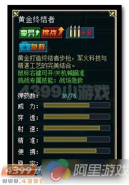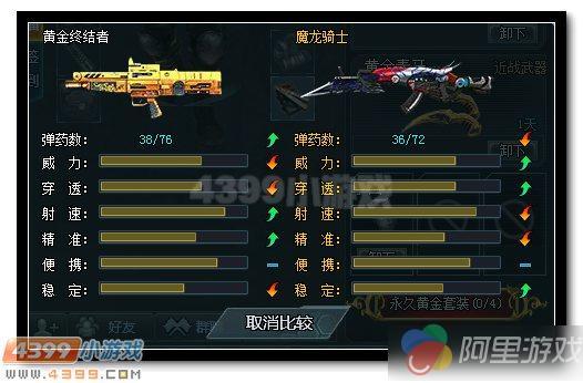 与英雄魔龙骑士相比,黄金终结者的弹药,射速,精准提升,稳定却丢了一大截,不说威力和穿透,威力穿透本来就是AK的优势,没有可比性,稳定为什么差那么多了,经过试验发现:黄金终结者射出子弹时后坐力较大,魔龙骑士较小,什么是后坐力呢,我们来骚骚的科普一下:枪械发射时子弹壳同样受到火药气体的压力,从而推动枪机后坐,后坐的枪机撞击和枪托相连的机框就叫后坐力啦,拉回正题,魔龙骑士在射击时枪械很少后去,而黄金终结者就恰恰相反,大家可以试验一下,没有黄金终结者的兄弟拼一把RMB在买个3天的或者等活动试一下,这项属性在战斗中还是很重要的。