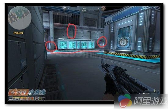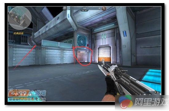 这个大家都看明白了吧,这是对手老窝前面的一个台子,每当对手过来时(红色箭头),你就可以一招狙死对方,失败了还可以迅速躲在旁边的掩体后,建议使用重型狙击,不需要队友。