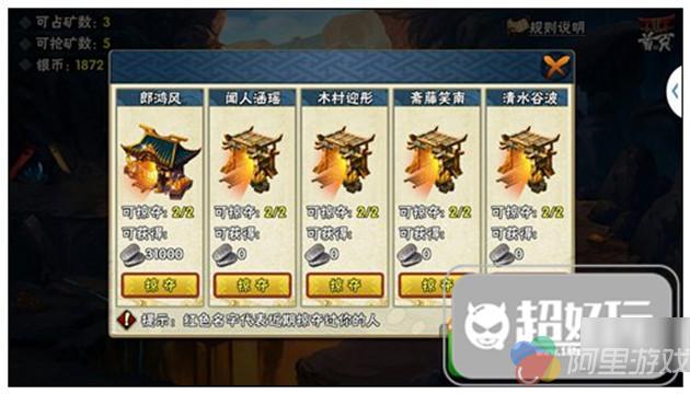 点击【开始占矿】可占领矿场,可花费一定元宝立即完成开采,可避免被掠夺。