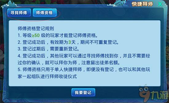登记成功后,其他玩家可以通过寻找师傅找到你,并且不需要经过你的确认,就可以拜你为师。
