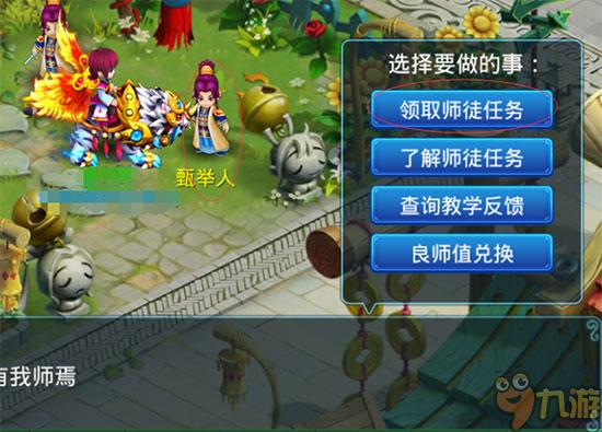 玩家一旦确定师徒关系,便可以在贾举人旁边的甄举人(50,155)处领取师徒任务: