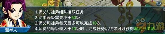 师徒任务需要师傅和徒弟组队来领取,徒弟等级要小于60级,师徒任务每天最多可以完成10次。师徒等级差大于10级时,完成任务后徒弟可以获得演武丹奖励。