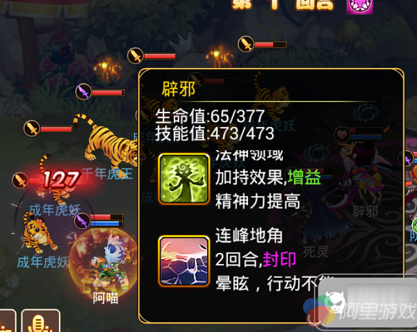 5.千年虎王,施放连峰地角技能(成年虎妖也可以施放),晕眩,不能行动,这里挂机躺过。