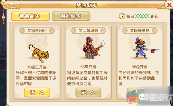 梦回副本是35级开启的,组队副本之一,梦回副本分为普通和困难两个级别,虽说只有2个级别,但难度还是差别挺大的。副本按等级又分为3个级别,分别是35级梦回景阳冈,65级梦回黄泥冈,95级梦回野猪林,同一副本,每天首次通关才有奖励,24点重置副本。这次我们先来看看35级梦回景阳冈副本。