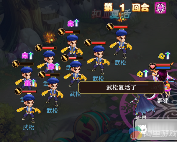 4.武松,浴火重生,让小怪无限复活,这个要重点强调一下,新手可能打到这里就纳闷了,前面都挂机趟过,这里无限复活这怎么玩?其实奥秘就是后排中间的那只萌萌哒武松,需要先手动干掉他,然后整个团队就失去复活能力了,轻松搞定~