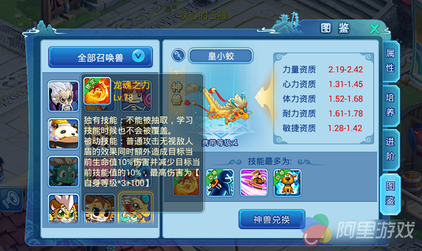 值得一提的是,“龙魂之力”和“游龙戏水”两个独有技能不会在神兽学习技能,俗称“打书”时被覆盖,大大减少打书过程中,反复覆盖强力的技能的坑爹情况。