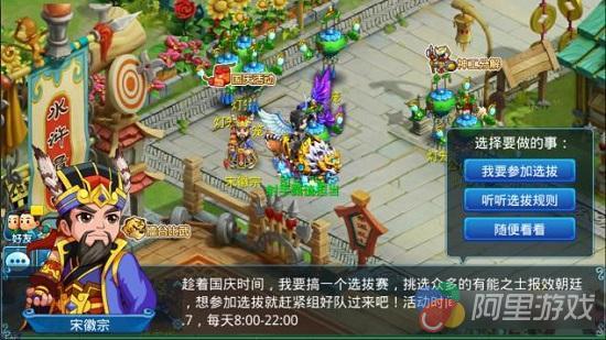 国庆到来,宋徽宗突发奇想,希望招揽更多能人异士,因此特地举办全国选拔赛,甄选有实力的愿意报效朝廷的能者。在国庆期间,玩家每天早上8点开始,即可组队参与选拔赛。组队成功后,玩家最多可挑战由朝廷朝廷安排的10道关卡,每道关卡均由朝廷安排的统领把关,实力强劲。