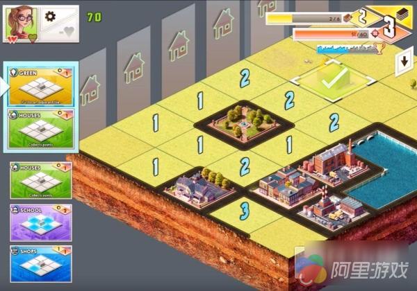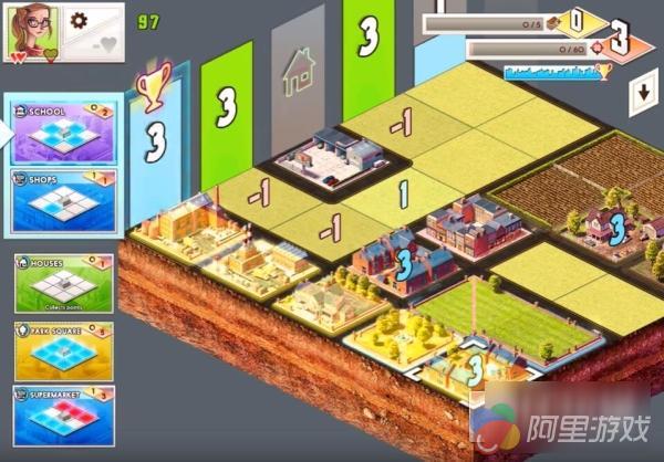 该作并没有给予玩家非常大的自由建设空间,整个游玩过程都在数个十分整齐的四方形网格内完成。玩家需根据系统在左侧随机提供的建筑卡牌中进行挑选,把合适的建筑放置在右侧的网格内,看似简单的操作玩起来却十分烧脑,皆因不同类型的建筑将会有着相加相减的设定,合理的规划不仅能使得百姓安居,更能让城市经济稳步增长,这也是游戏的策略性所在。