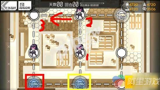 4、在打第一关时(看下图),小编建议先把队伍中最强的一队(作战效能必须超过一千六)放在黄框的那个点另一个点可以随便放一队然后就可以不需要管这一队了(因为之后战斗用不到),然后然后黄框的那一队可以根据下图指示的1—2—3点依次攻略(打过第二点之后左下那个敌人必定会向上走),这样训练资料就可以轻松获得了。