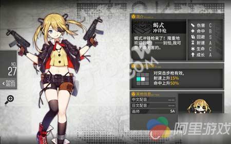 在少女前线中蝎式的入手难度很低,生命值虽然不如同为三星冲锋枪的司登但是S级的回避前期的生存力还是蛮强的,影响格方面向后的射速上升和命中上升,特别是命中上升50%对于后期命中不够啃图的帮助是巨大的。技能方面燃烧弹的缺点就是范围太小,一般就只能打一个,但是伤害比手榴弹要高点。总之虽然综合能力上不如同级别的司登那么给力但是也算是前期数一数二的好T了。