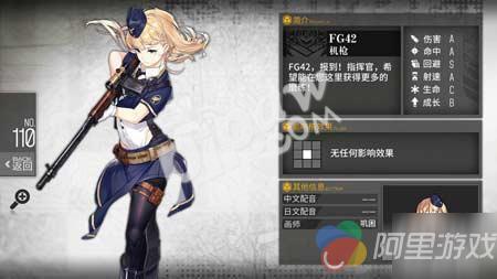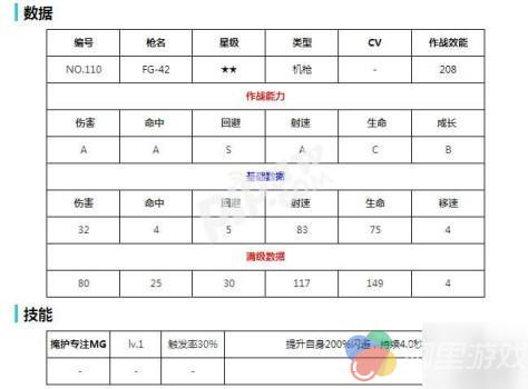 二星机枪FG-42在前期并不是非常难拿,属性上FG42拥有S级的回避即便如此也初始只有5点回避而伤害命中射速都是A级,这样在前期都可以算是不错的数据了而B级的成长影响了她在后期增幅,技能上提升自身200%闪避,持续4.0秒算是一个不错的保命技能了。