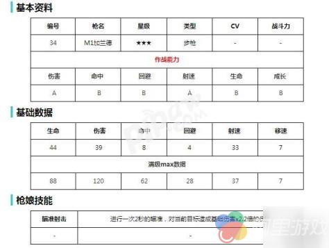 M1加兰德步枪在前期总体属性上超过号称三星RF之王的SV-98,A伤害和A命中然而由于B的成长在40级左右时会被渐渐超越。影响格方面三点钟方向的buff加成也有助于自己吃到buff,技能效果是进行一次2秒的瞄准,对当前目标造成基础伤害x2.2倍的伤害,可以说经常可以秒掉对面敌人特别是前期的时候。总之实用性很不错的3星RF。