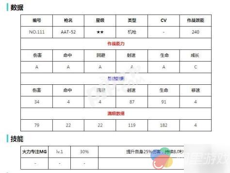 AAT-52在数据上除了成长外基本都是A在前期对于那些血量较厚的敌人来说这是一把不错的磨血枪娘,C级的成长值在后期成长增幅上不会太给力但是这并不妨碍我们前期的使用,技能方面效果为身25%伤害,持续8.0秒,如果在保证命中率的情况下这将是一个非常可观的输出。