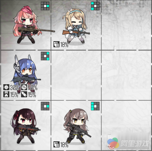 说明一下配枪的思路,首先2SMG定死不谈,由于这个阵容没有光环收益,因此采用U阵来使SMG分摊伤害。而后排2RF已经保证了对敌人后排有着足够的输出,我们只要能让RF快速打到敌人后排,就可以减少SMG的压力。
