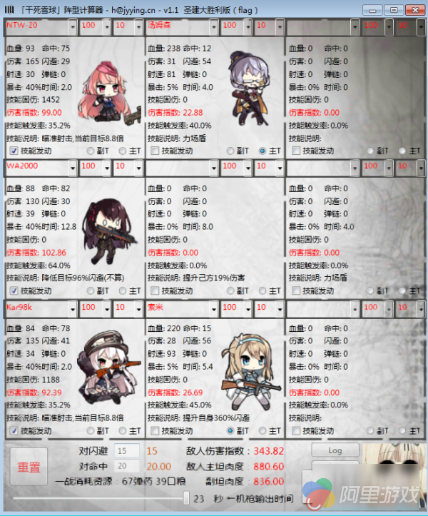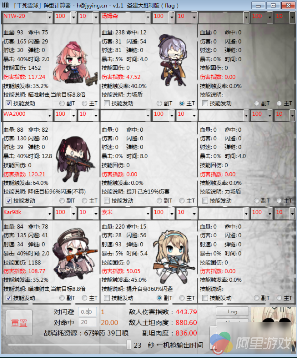 当WA2000触发技能时,则根据数据,减少BOSS96%闪避,BOSS的闪避降为0.6,由于阵型计算器本身缺陷,只能取1来计算。此时,我方伤害指数提升为443,对BOSS秒伤为:443X5S=2215。