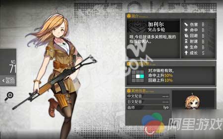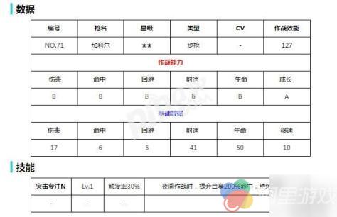 作为一把拥有夜战技能的步枪加利尔在属性上除了成长值得一提以外弦羽我真的想不出他的其他方面有什么突出点了(输出能力非常低在前期没有突击步枪时可以凑合着用)影响格方面是对前方(三点钟方向)的冲锋枪命中回避加成比较适合与一些有输出又有抗伤害能力的冲锋枪做前后的编队,技能上为夜战技能(提升自身200%命中,持续7.0秒。)在限制颇多的夜战时有比较大的作用。