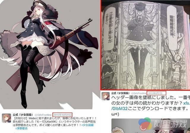 在《少女前线》上线测试之后还发生了一件趣事,那就是日本知名动漫作品《虫奉行》的一个角色抄袭了《少女前线》中毛瑟98K的人设造型。当玩家们发现后,云母组在日本推特上发文质疑——当时已经拥有近万粉丝的《少女前线》官博一经发声,便引发日本画师的集体关注。