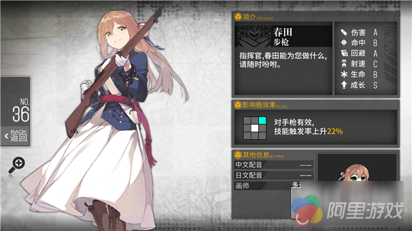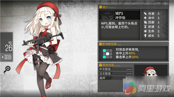 在养成工作开始之前,我们先得知道人形的各项属性代表什么。在《少女前线》中,人形一共有6项属性:伤害、命中、回避、射速、生命、成长,每一项属性都分为D-S级。除成长属性之外,其他五项属性的级别反映了人形初始的属性值,级别越高,该属性的初始值越大。而成长属性反映的是人形等级提升后,前五项属性的可提升幅度,成长级别越高,提升幅度越大。