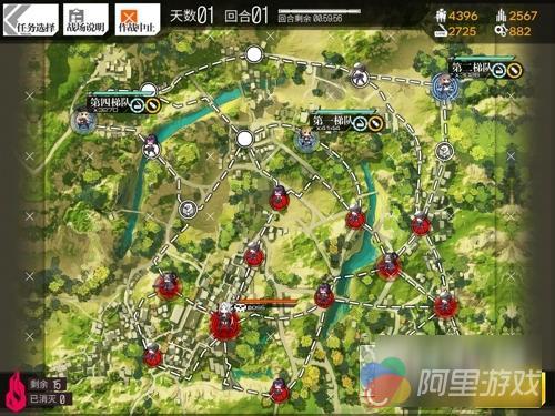《少女前线》还有一个与一般卡牌手游不同的地方,就是它的战斗系统更有深度,并不是点击关卡,然后进去一通自动战斗就能解决问题。当玩家进入某个游戏关卡时,面对的是一个比较复杂的沙盘地图,上面有很多点位通过不同的路径连接。每回合玩家的行动受到行动点数(AP)的限制,玩家可以在地图上部署多个梯队,在沙盘上多线推进打击敌人,最终完成任务目标。