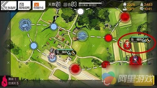 注意:包围规则的结算时间是在包围方回合开始时,所以玩家梯队不能进入被敌方包围的据点进行反包围。因为玩家结束回合后,敌方回合先开始,所以会先结算。如同下图中的例子,玩家第一梯队占领的据点会在敌方回合开始时被重新包围占领。