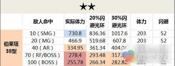 2星狗粮伯莱塔38型,因为高血量的优势,就算闪避最低,实际的肉度也高于了平均水平,而且技能还是很实用的闪光弹,考虑到是2星,也算是战神了,缺核心缺SMG的指挥官可以考虑练她。