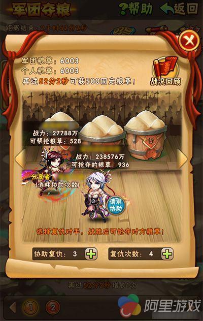 《少年三国志》夺粮战系统重新制作啦!少年们终于可以不再“同服相煎”,而是一致对外,跟随所属军团跨服夺粮!每周二、四12点-20点,65级以上的少年,点击“竞技场”—“军团夺粮”即可开启游戏。少年们由系统随机匹配三个军团作为对手,任意点击一个对手军团,就会显示该军团内所有可夺取玩家,凭借战力一较高低,胜者就可以夺走败者的粮草!系统有一定几率下会出现抢夺暴击,这时候可以额外夺取更多粮草哦!