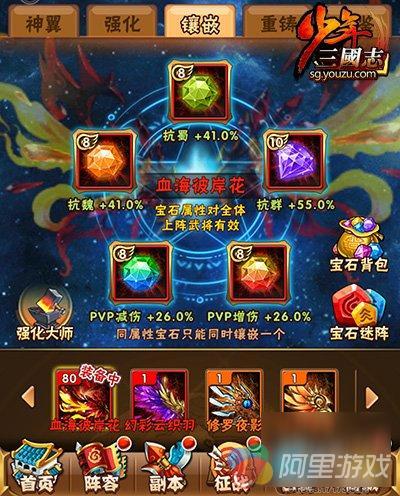 少年们还可以用宝石镶嵌神翼,红色神翼的宝石镶嵌位有5个,同属性的宝石只能镶嵌一个位置,不同属性的宝石能够给神翼带来不同的加成。宝石可通过宝石迷阵以及游戏中收集到的宝石箱获得。