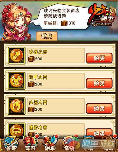 开启装备化金系统是《少年三国志》对装备系统进行的重大革新。少年们可在原有的红色装备基础上,利用化金材料进行升级,获得金色装备。化金材料可在玩法“攻城掠地”中获取,整个化金过程分为5个阶段,每升一阶,装备属性都可获得大幅度提升。