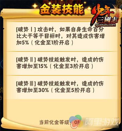 金色装备除了华丽霸气的造型还具备了4种特殊技能:破势、刚毅、固法和血战。这4种装备技能触发条件都和武将的血量相关联特别是“血战”技能,在武将血量百分比小于一定量时会瞬间加大伤害输出,可给予少年逆转战局,触底反弹的机会。技能之间攻守互补,共同为上阵武将提供强大的战斗支持。