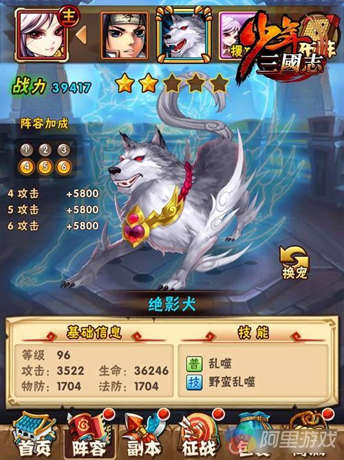 在实战中,绝影犬拥有很强的单体输出能力,在关键时刻作为补刀手的存在,但是由于技能是攻击随机一个目标,有时候也会比较蛋疼。不过绝影犬的神炼,给后排位置的武将增加大量的攻击加成,这点看是很值得培养的。宠物的资源主要在百战沙场玩法产出,资源可以在宠物商店消费,技能的触发几率可以通过升星来提高,平时注意多收集同名战宠碎片。