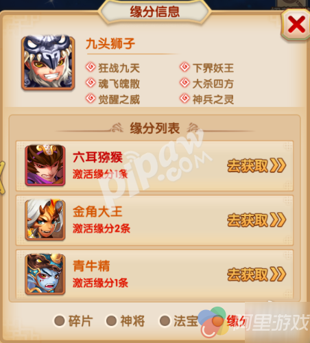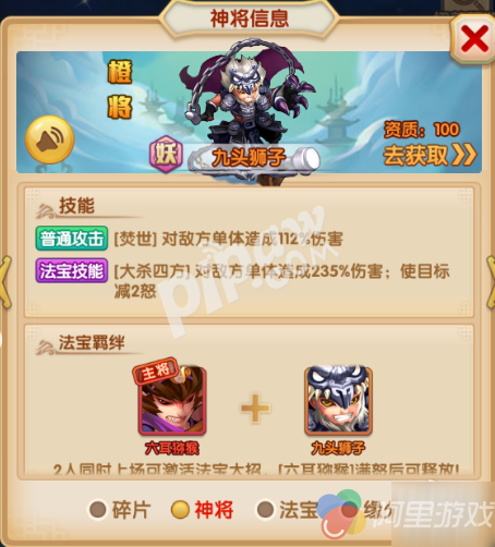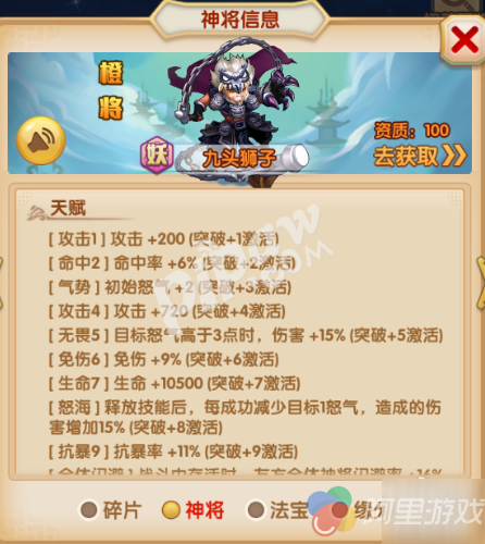 九头狮子是红将六耳猕猴的副将,伤害上面还是不错的,当然跟其他的武将比起来九头狮子目前来说还是不怎么值得培养的,毕竟红将还没有出不能和六耳猕猴进行配合。