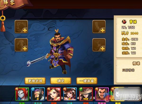 进入阵容界面,阵容界面显示武将基本属性,装备,和情缘