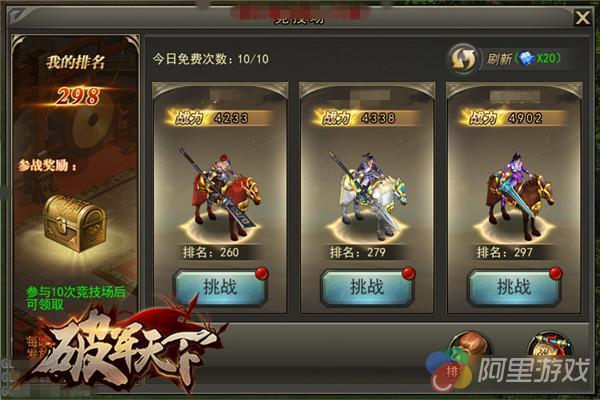 在《破军天下》手游竞技场中战斗力是最为重要的判定标准,排名就是实力的证明,挑战比自己排名高的对手,胜利后就可以顶替他的名次,与登高的快感相同,等你攀到顶峰的时候,一览众山小的时候,将是你成就自我的巅峰时刻。