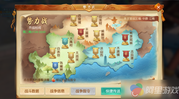 势力战的号角每周都会在九黎,江南,中原等地方吹响。玩家们需要占领分布在大荒各处共12个祭天台,各大势力主们需要带领精英成员发起争夺战,120名大荒英豪将同场竞技,为各自势力争取荣耀。
