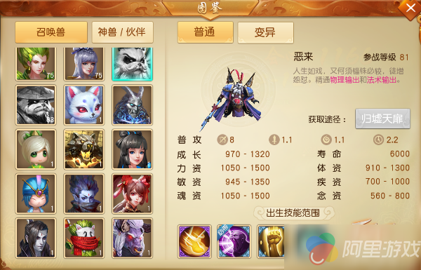 恶来不仅性格刚毅勇猛,输出能力强大,而且资质成长较高,属于值得玩家重点培养,性价比较高的宠物。通过技能书学习玩家可以提高成长各项资质还能增加技能数。目前玩家可玩家可以通过参加归墟天扉副本,来获得这只潜力无穷的召唤兽。