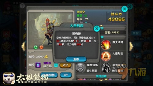 稀有技大圣形态可以增加(50+武神进化数*3)%的伤害减免,进化15后,免伤高达95%,可以说就是一个无敌状态。高免伤对应的肯定是低伤害,这也是孙悟空最大的弱点。不过猴子转生之后,特别是掌握了专属领悟“人来疯”、“尖刺毫毛”,伤害会有质的提升。但如果没有专属领悟怎么办呢?那就只能依靠武神搭配来弥补,所谓取长补短。