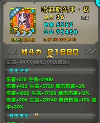头部:哈迪斯头环,突破4之后有52%爆伤、18%暴击、30%命中、26%爆免,属性相当可观。