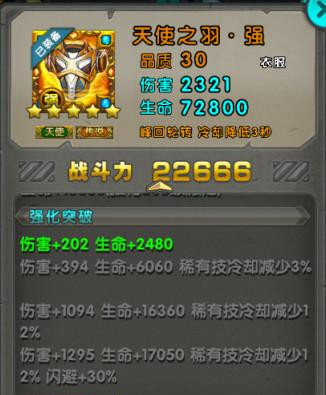 胸甲:天使之羽,天使衣服可以缩短1技能CD,增加39%暴击和30%命中,对于刺客来说非常实用。虽然死神衣服突破4之后加50%爆伤,但是不减CD,而且精炼属性比天使衣服稍差,故选择天使衣服。