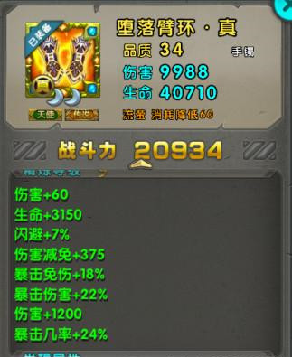 手镯:堕落臂环,突破4后增加68%爆免、46%爆伤。如果玩家觉得自身命中不够的话,也可以选择死神手,不过天使手在属性上是要比死神手稍好的。天使手突破4后的50%爆免,相比死神手的闪避属性,要更加适合三暴流,因为闪避这个属性对于走三暴流路线的玩家而言比较鸡肋。