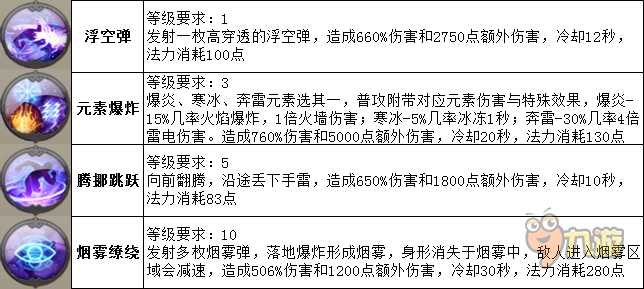 ♦火元素:普攻会附带火墙伤害,同时命中必定会出现火焰爆炸,爆炸伤害为火墙伤害