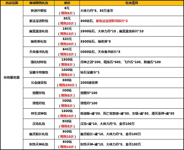 1、活动时间,礼包将在游戏商城的道具柜面出售,请注意活动范围及限购次数;