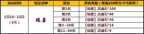 活动期间开启限时指定武魂活动,您在“精彩活动”对应活动界面进行宝藏抽取,即可有几率获得指定武神魂,积分排名1-50名且积分大于等280点的玩家将有额外排名豪礼相赠。
