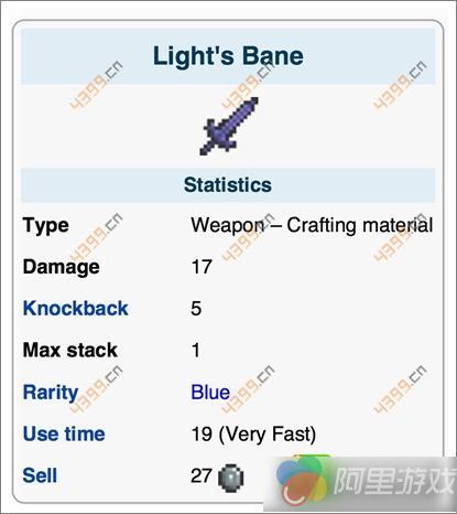 另外「knock back」一栏是击退能力,数字越大能力越强。五的击退在肉山前是数一数二的了。但是一个打不到人的武器。。。击退再强也不好用啊!加上肉山前击退能力用处较小导致光之驱逐沦为鸡肋。。。