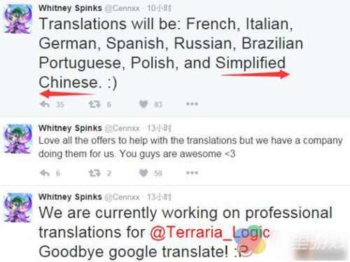 Whitney Spinks宣布将会在《泰拉瑞亚》中加入法语、意大利语、德语、西班牙语、俄语、葡萄牙语、波兰语和简体中文。相信很多玩家对于外国游戏加入中文在感到非常开心的同时,也会担忧翻译的质量,Whitney在推特上向各国的玩家保证,《泰拉瑞亚》中加入的新语言将会是绝对专业的翻译,绝对不会是谷歌翻译,这种认真的态度很值得赞赏。