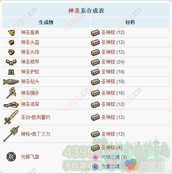 泰拉瑞亚神圣锭合成表(需要在秘银砧处做)