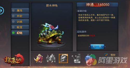 碧水神龟由200阶赤血魔蝎蜕变而来,它的样貌像极了远古神兽-玄武,丰厚的防御属性加成让它的防护能力极为突出。