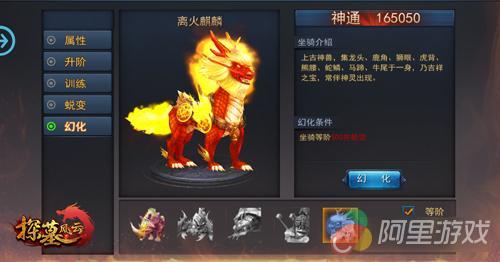 “离火麒麟”为目前游戏内最终形态的坐骑,需要坐骑达到500阶并蜕变。周身火焰包围,传奇色彩浓重,拥有最高的属性加成以及最为炫酷的外形。